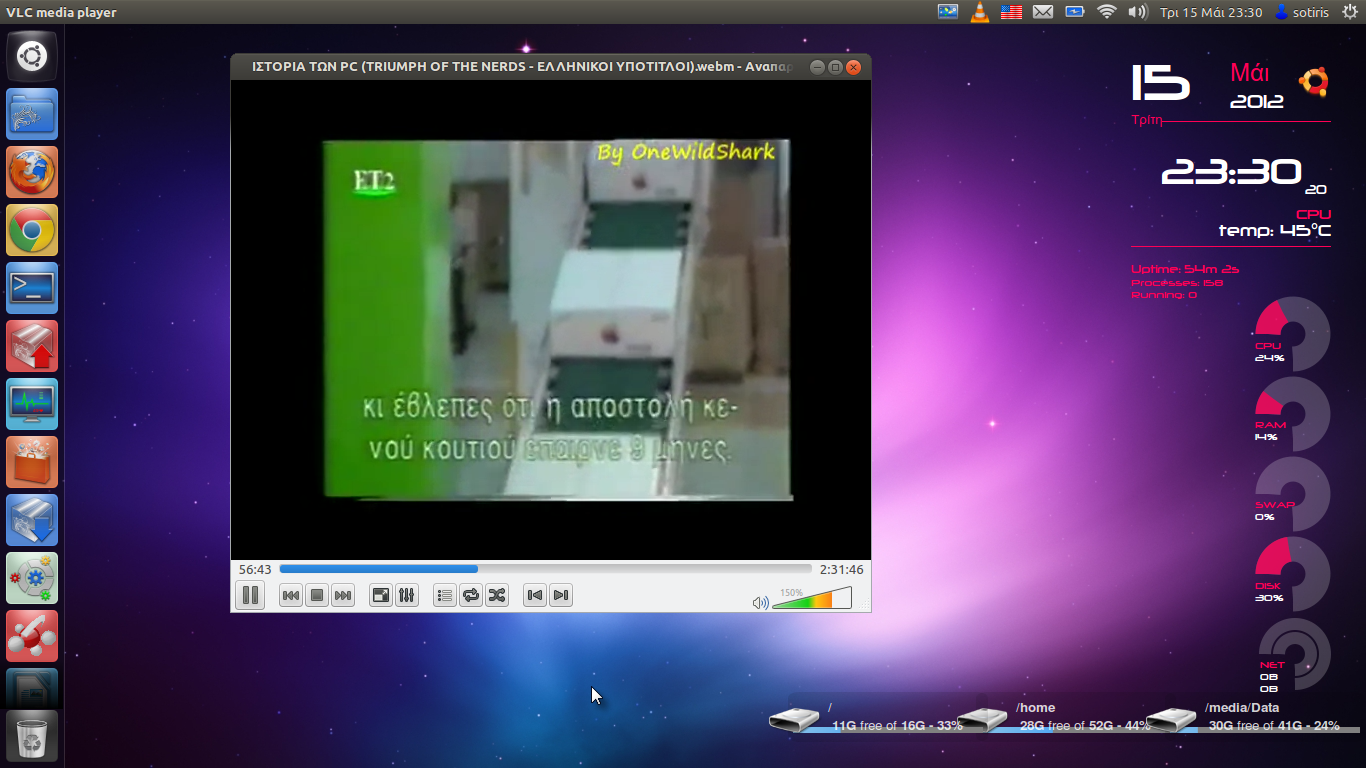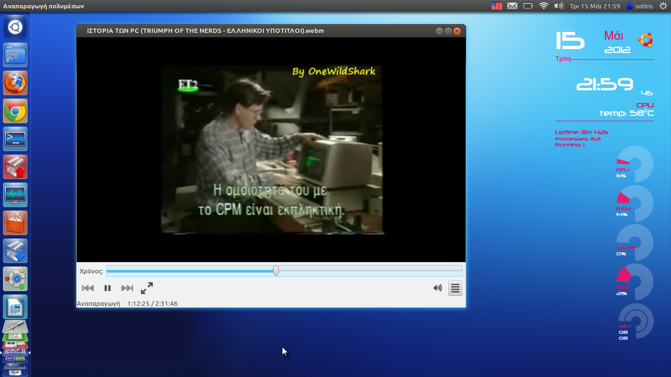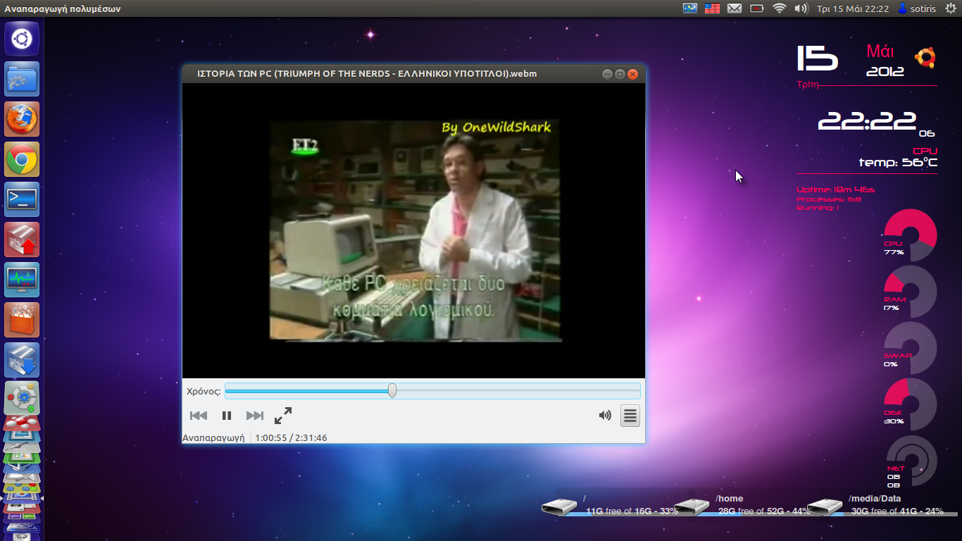 βλέπουμε υψηλή θερμοκρασία 56 βαθμών(σε idle ήταν 45) και χρήση cpu(το 50% από το 77% αφορά το compiz) και εδώ το ίδιο βίντεο ακριβώς αλλά με unity 2d