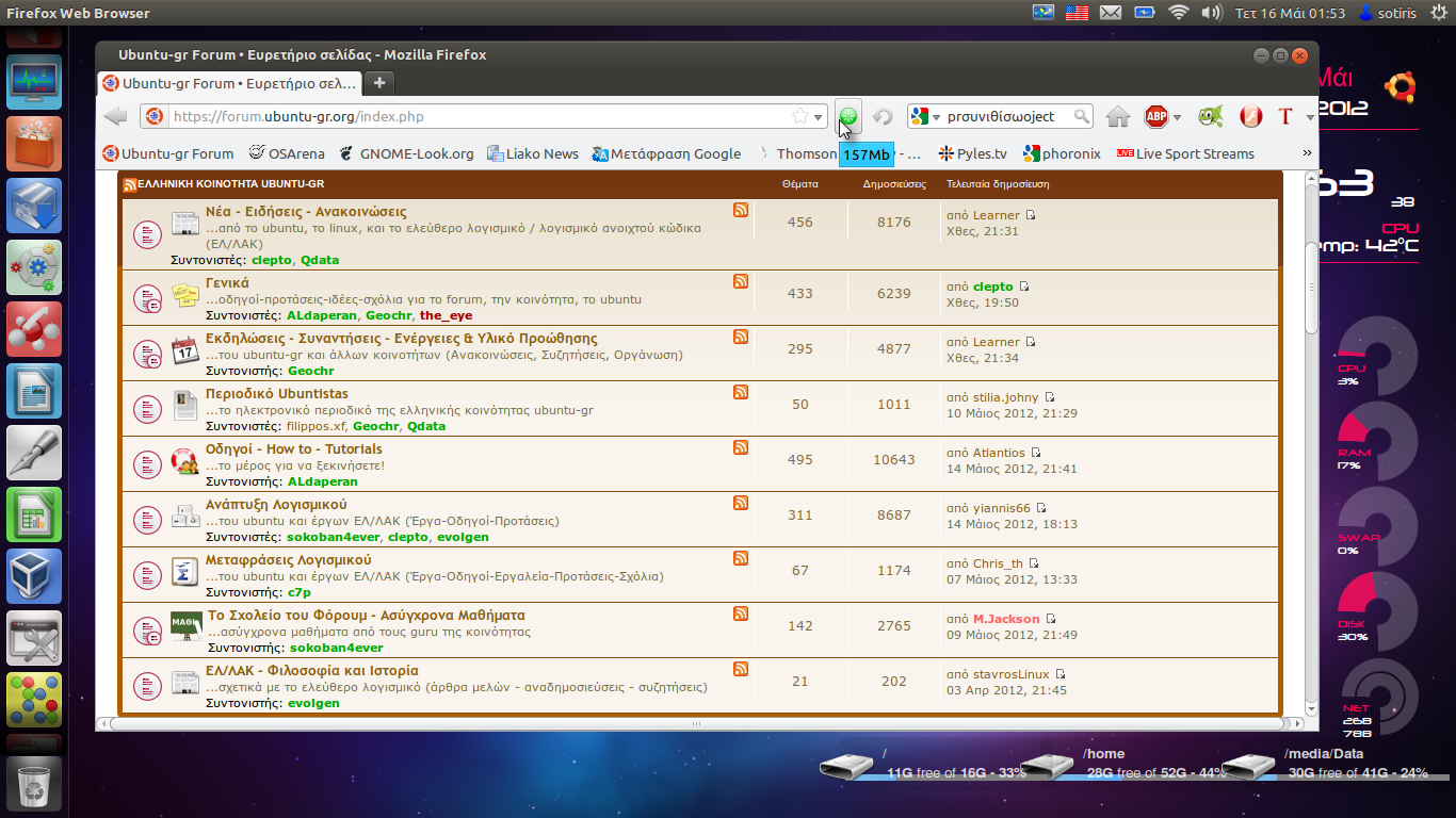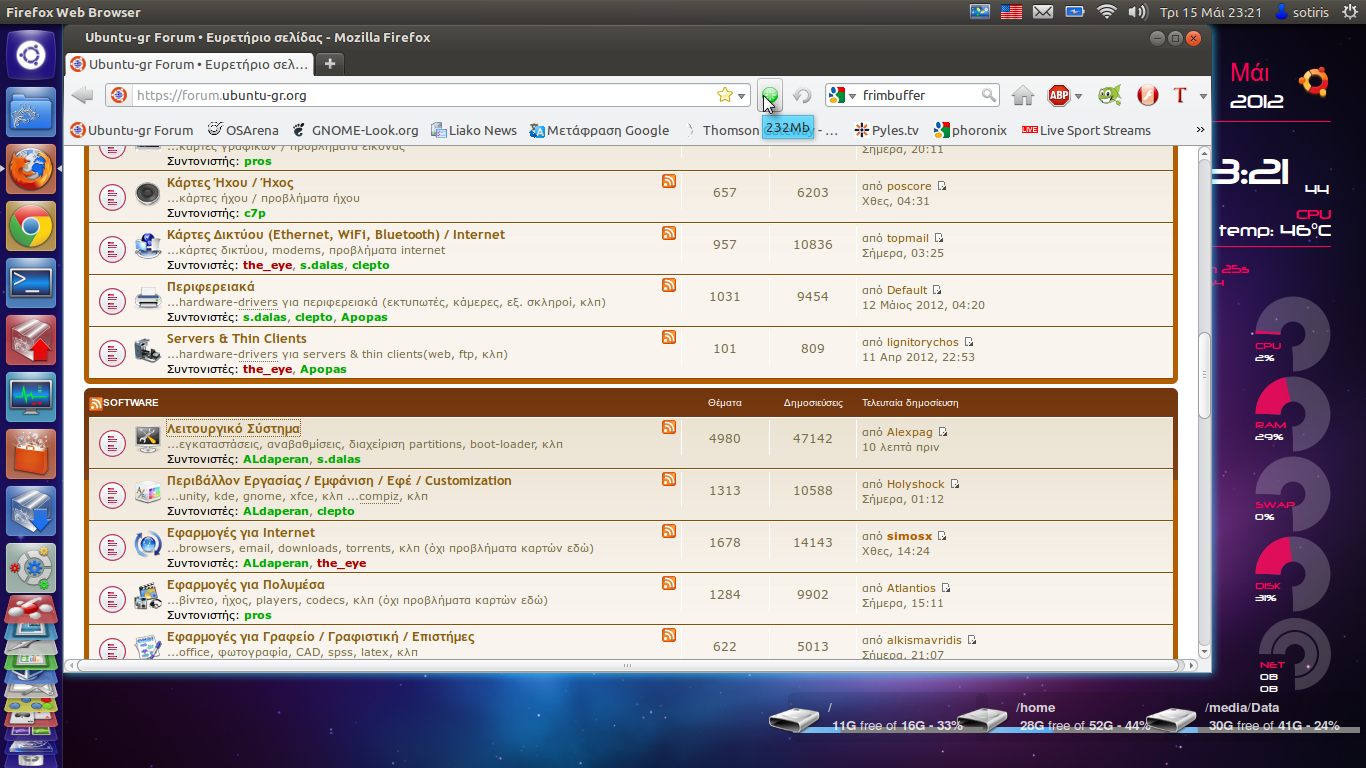 καλή θερμοκρασία και χρήση cpu αλλά η μνήμη είναι στο 29% που αντιστοιχεί σε 1,1 GB στο σύστημα μου, η χρήση του firefox είναι 232 ΜΒ(προσέξτε εκεί που είναι ο κέρσορας) και αν τον κλείσω μόνο τα 232 ΜΒ θα επιστραφούν στο σύστημα.Αν δεν τον κλείσω, το 1,1GB θα συνεχίσει να ανεβαίνει μέχρι να φτάσει τα 2GB,εκεί θα φάει ένα χαστούκι από το σύστημα και θα γυρίσει στα 1,2GB για να συνεχίσει όμως τον ανήφορο μέχρι τα 2GB(μέσα σε 3 λεπτά) και μετά πάλι από την αρχή(οφείλετε σε συνεχόμενη ανταλλαγή framebuffer μεταξύ ram και vram). Σε unity 2d