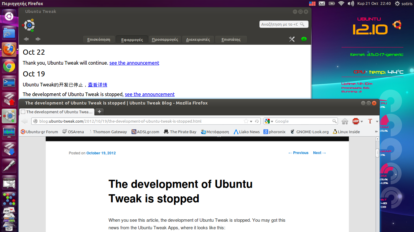Ήρθε πριν από λίγο ενημέρωση του ubuntu-tweak και λέει, όπως βλέπεται στην εικόνα, ότι θα συνεχιστεί η ανάπτυξη, αν όμως κάνεις κλικ στον σύνδεσμο ανοίγει ο firefox και σε πάει σε ιστοσελίδα που λέει ότι σταματά η υποστήριξη.