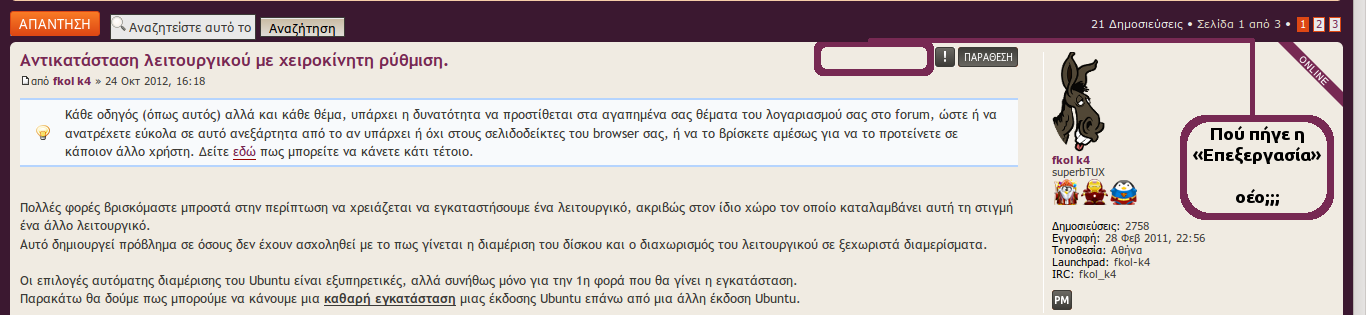Θέλοντας να προσθέσω ένα κομμάτι σε αυτόν τον οδηγό (επανεγκατάσταση με διατήρηση του προσωπικού φακέλου χωρίς ξεχωριστό /home partition), παρατήρησα πως δεν έχω τη δυνατότητα επεξεργασίας της δημοσίευσης.
