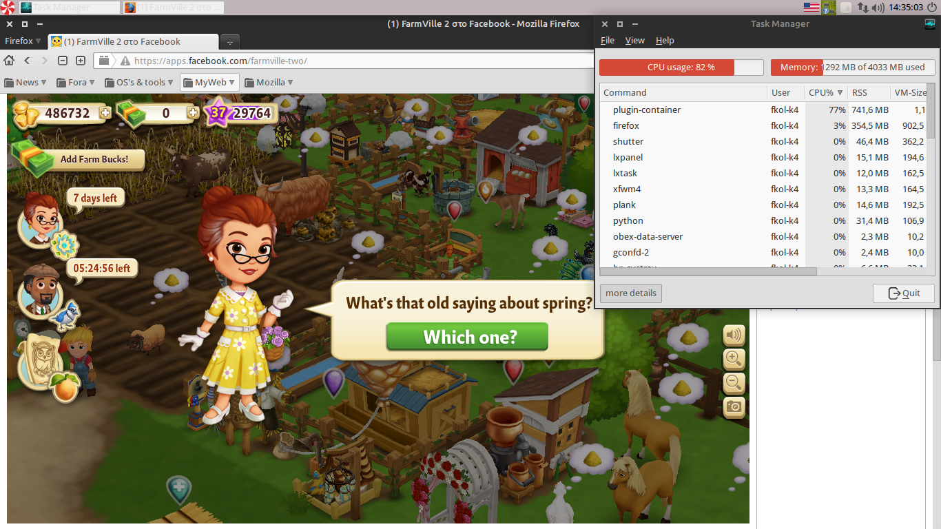 Το λειτουργικό σύστημα από όπου τραβήχτηκε το σύστημα είναι PeppermintOS 4 (δηλαδή σαν να λέμε Lubuntu) 32bit (στο 64bit η κατανάλωση μνήμης πλησιάζει τα 2GB), τα μόνα πράγματα που τρέχουν είναι μια καρτέλα στον Firefox και το system monitor, έχω ενεργό Adblock plus και Flash block με μόνη εξαίρεση το παιχνίδι, ξεχωριστή κάρτα γραφικών με 2GB αυτόνομης μνήμης, δεν έχω καν αρχίσει να παίζω (δεν ξέρω κιόλας να παίζω) και αν μη τι άλλο το λειτουργικό είναι τέλεια συντηρημένο, μιας και οποιοδήποτε Ubuntu-based ή Debian-based λειτουργικό ξέρω να το συντηρώ πολύ καλά.