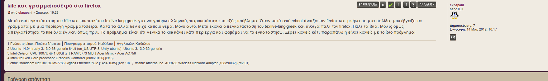 Μετά από εγκατάσταση του Kile και του πακέτου texlive-lang-greek για να γράφω ελληνικά, παρουσιάστηκε το εξής πρόβλημα: Όταν μετά από reboot άνοιξα τον firefox και μπήκα σε μια σελίδα, μου έβγαζε τα γράμματα με μια περίεργη γραμματοσειρά. Κατά τα άλλα δεν είχε κάποιο θέμα. Μόνο αυτό. Μετά έκανα απεγκατάσταση του texlive-lang-greek και άνοιξα πάλι τον firefox. Πάλι τα ίδια. Μόλις όμως απεγκατέστησα το kile όλα έγιναν όπως πριν. Το πρόβλημα είναι ότι γενικά το kile κάνει κάτι περίεργα και φοβάμαι να το εγκαταστήσω. Ξέρει κανείς κάτι παραπάνω ή είναι κανείς με το ίδιο πρόβλημα;