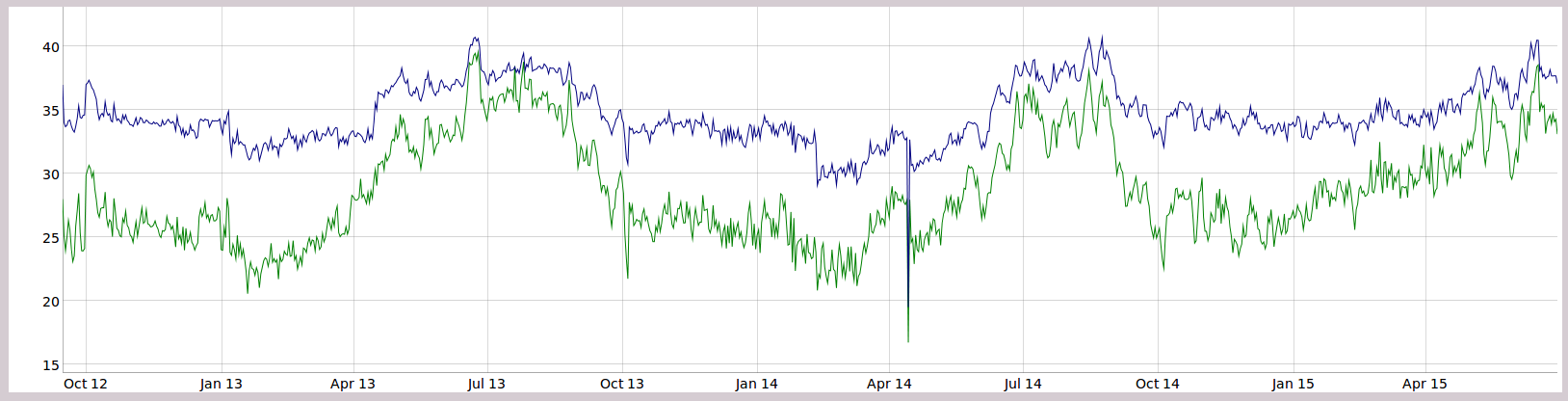 Να και μια φωτό με ιστορικό θερμοκρασιών στο pc μου. (Πράσινο cpu - Μπλε hdd)