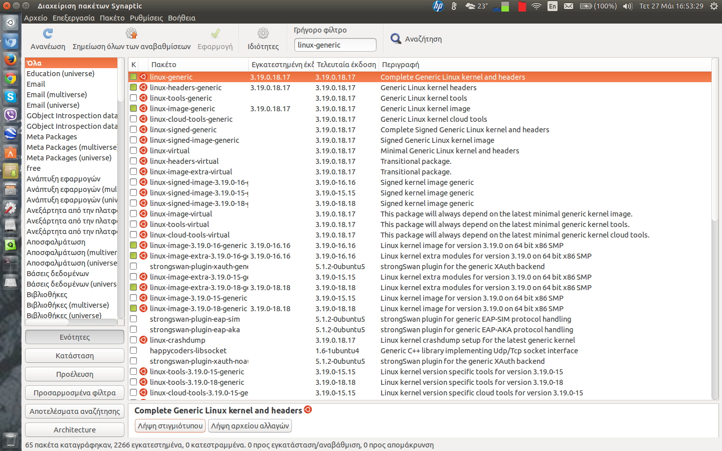Το θέμα kernels τείνει να γίνει το αγαπημένο μου πρόβλημα. Σε 15.04 και μετά από αναβάθμιση πυρήνα σε 3.19.0-17, το σύστημα κατέληγε σε απόλυτα νεκρή μαύρη οθόνη (έχει συζητηθεί εδώ) και έτσι τον απεγκατέστησα χρησιμοποιώντας την εντολή