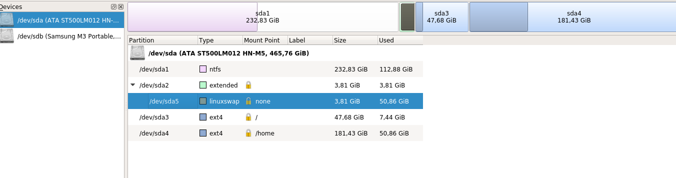 /dev/sda5 488284160 496281599 7997440 3,8G 82 Linux swap / Solaris