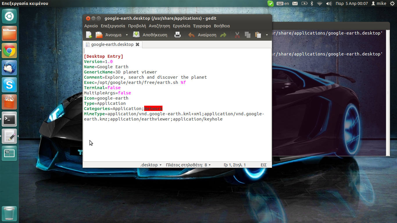 sudo gedit /usr/share/applications/google-earth.desktop[Desktop Entry]