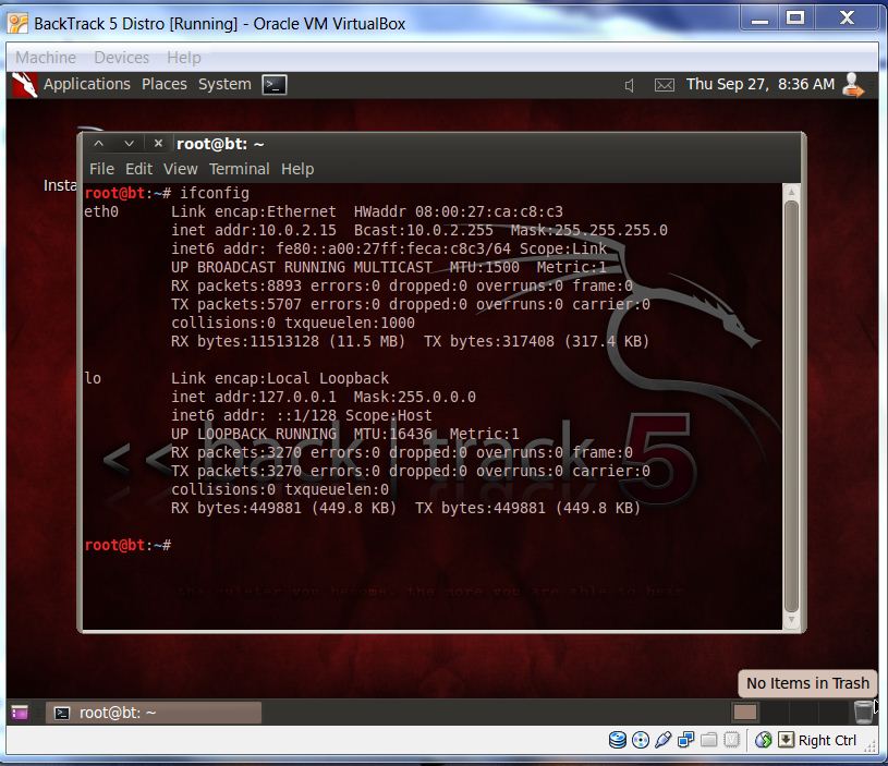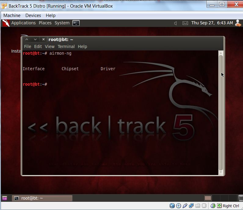 jonny3811 έγραψε:γεια σας, έχω ένα πρόβλημα με το backtrack προσπαθώ να το χρησιμοποιήσω για να δω πόσο ασφαλές είναι το ασύρματο δίκτυο μου, το κατέβασα και το χρησιμοποιώ μέσω virtualbox, έχω όμως ένα πρόβλημα όταν τρέχω την εντολή airmon-ng δεν μου εμφανίζει το όνομα του network interface τι πρέπει να κάνω γι αυτό;