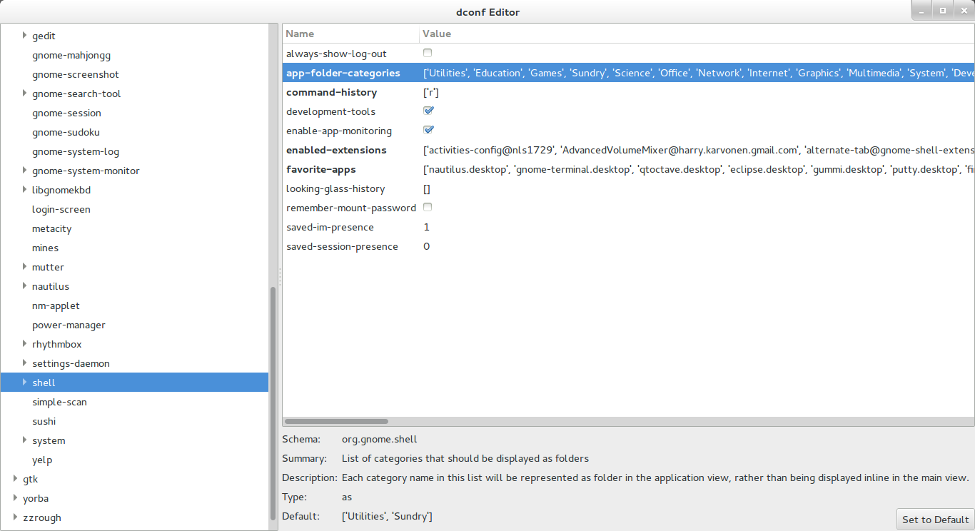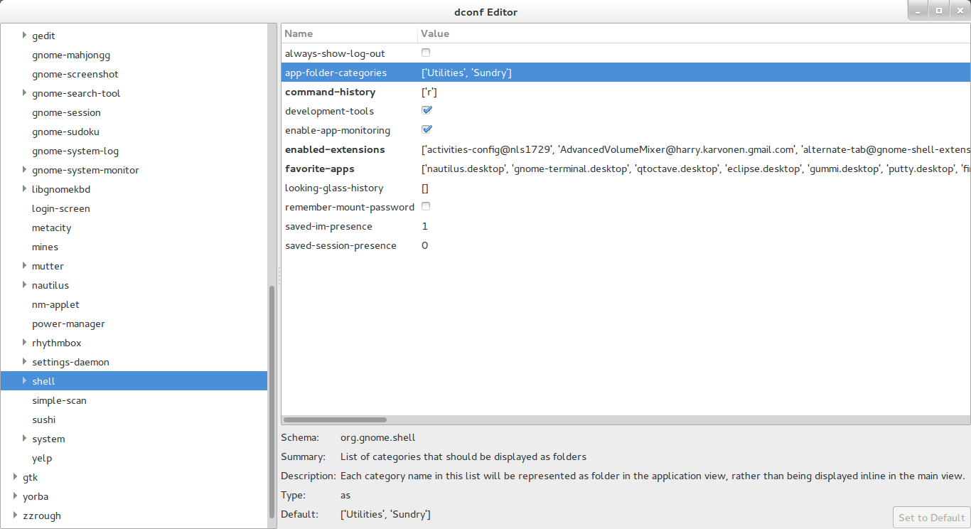 - Στο dconf-editor (org > gnome > shell) πατάμε Set to Default.