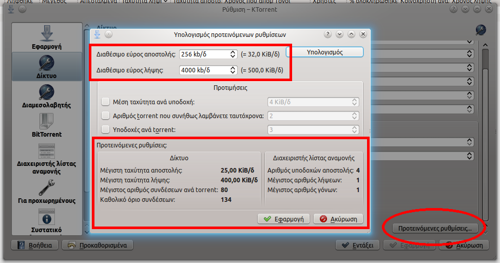 Καθώς έβλεπα τις ρυθμίσεις του ktorrent, πρόσεξα ότι έχει μια επιλογή "Προτεινόμενες ρυθμίσεις..." η οποία μου δίνει τα παρακάτω: