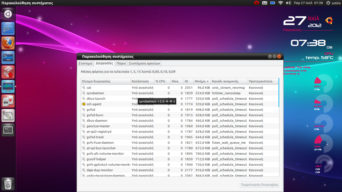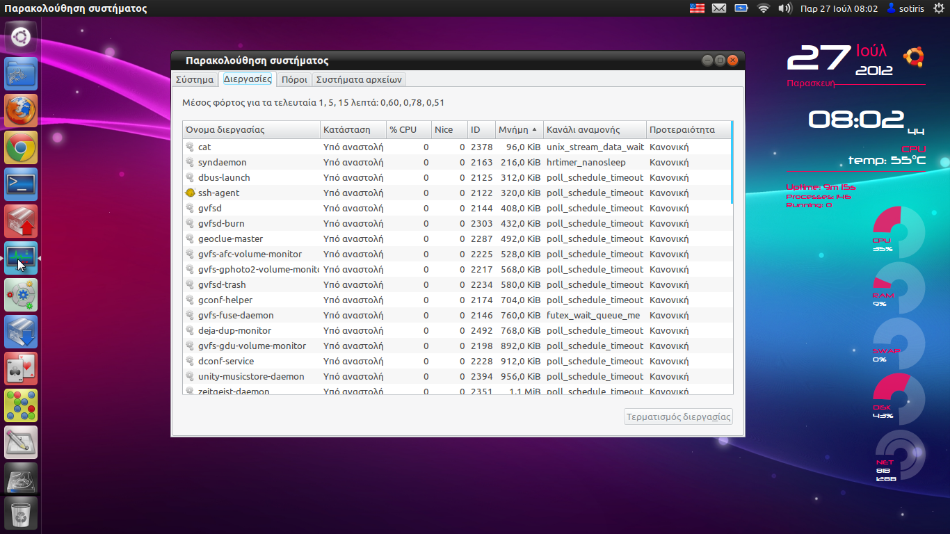 Στο conky φαίνεται διπλάσια χρήση cpu στην 12.04 35% έναντι 17% για να ανοίξω την παρακολούθηση συστήματος και να πατήσω το prt sc για να πάρω την φώτο της επιφάνειας εργασίας.